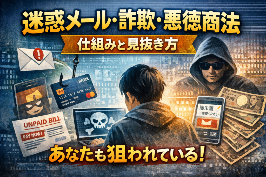 その多くは、金銭・個人情報・アカウントを狙う明確な目的を持ち、組織的かつ継続的に送信されています。このページは、迷惑メールをはじめとする各種詐欺・悪徳商法について、 仕組みを理解し、自分で見抜けるようになるための入口として位置づけています。